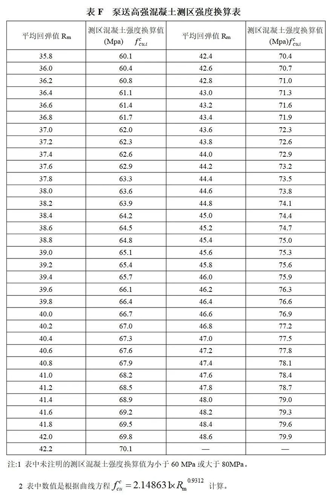 3 抗壓強(qiáng)度在(60~80)MPa的非現(xiàn)澆板類泵送混凝土構(gòu)件,測區(qū)強(qiáng)度可按本規(guī)程附錄F的規(guī)定進(jìn)行強(qiáng)度換算。
