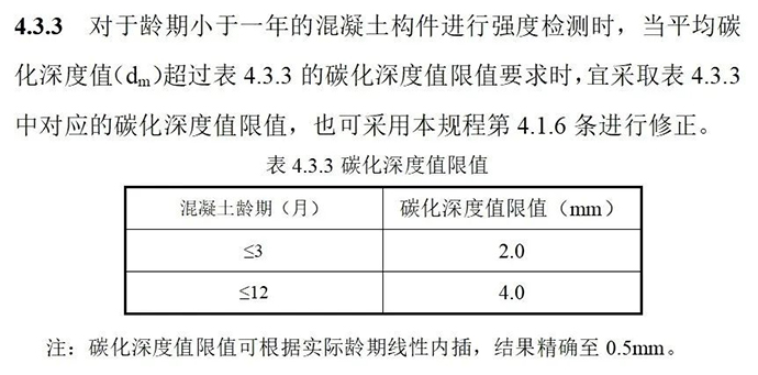9. 對齡期小于一年的構(gòu)件進(jìn)行強(qiáng)度檢測時,當(dāng)碳化深度值超過表4.3.3的限值要求時,宜采取表中對應(yīng)的碳化深度值限值。