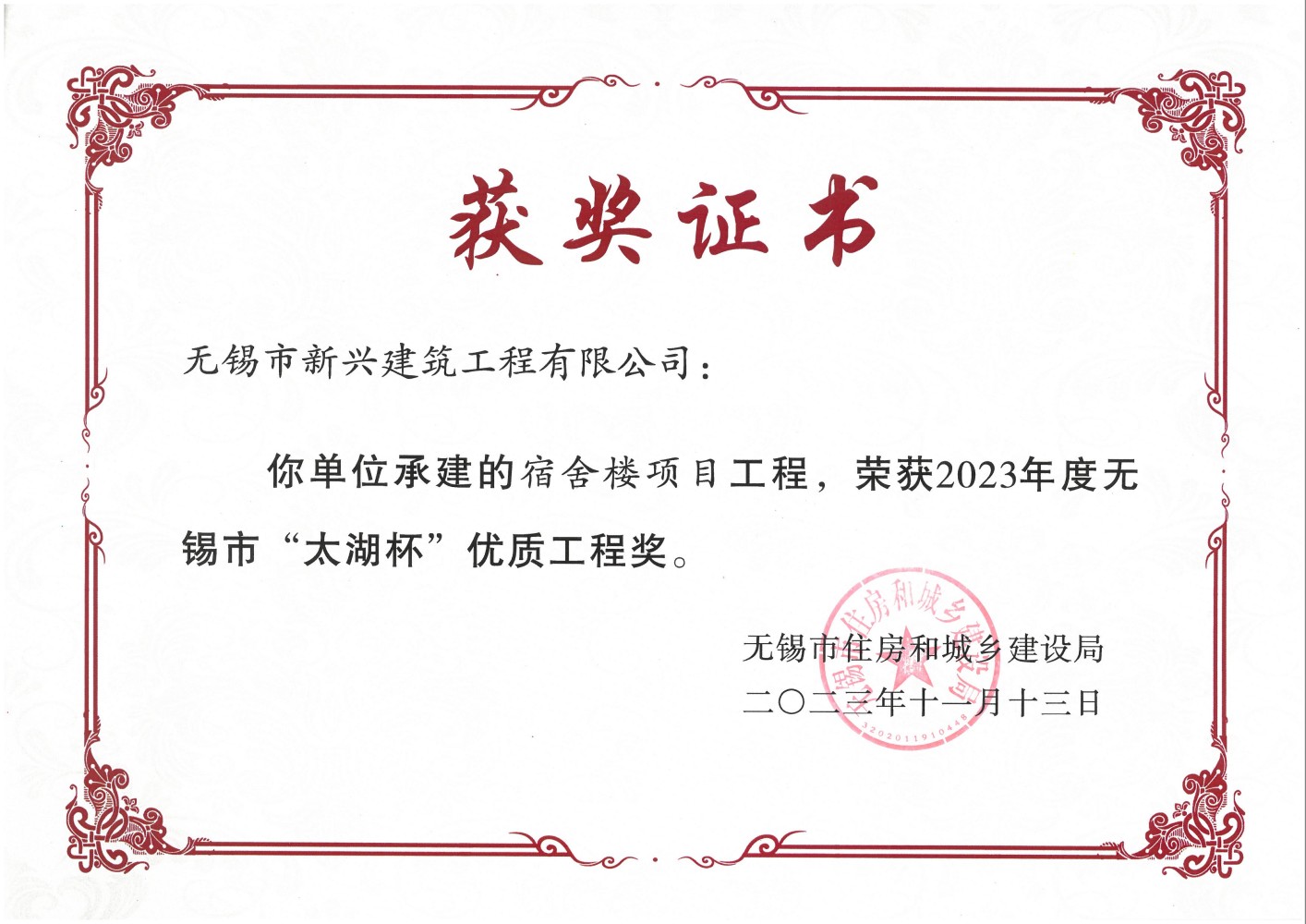 2023.11 新興建筑公司立信宿舍樓2023年度無錫市太湖杯優(yōu)質(zhì)工程獎(jiǎng)
