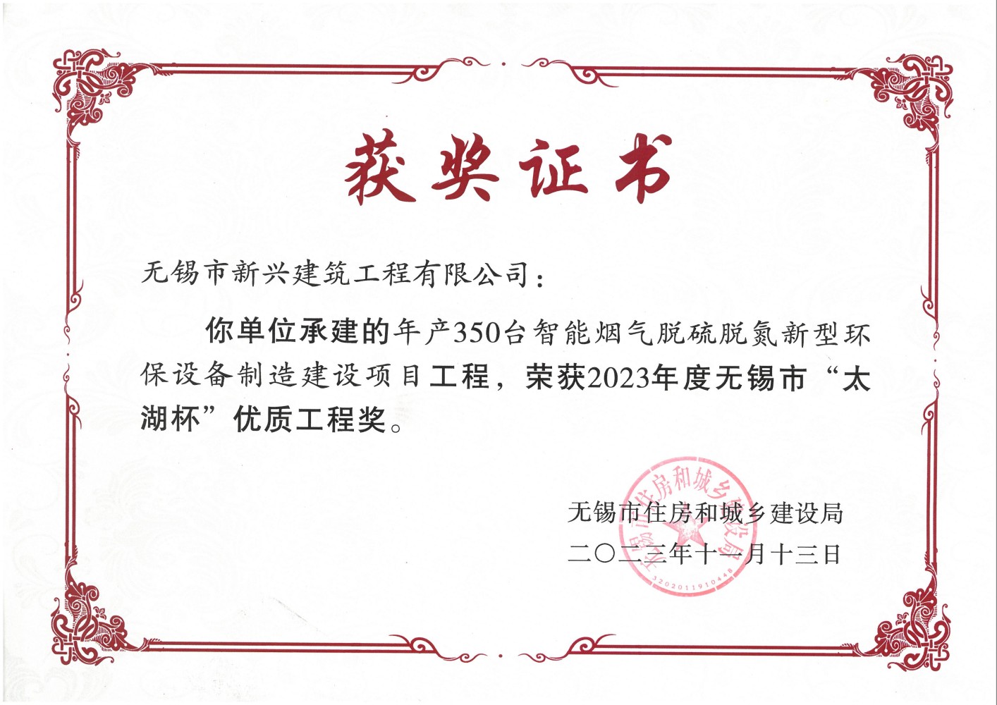 2023.11 新興建筑公司智能煙氣工程2023年度無錫市太湖杯優(yōu)質(zhì)工程獎(jiǎng)