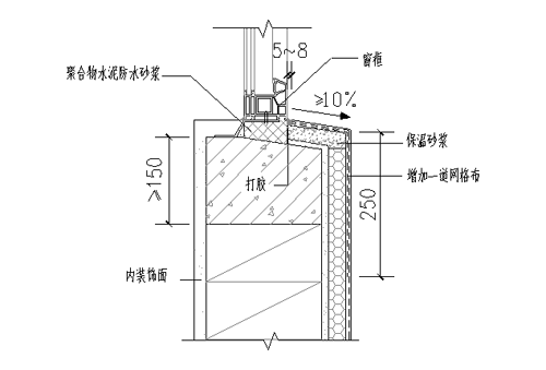 2.4外門(mén)窗框與洞口之間的間隙應(yīng)采用聚合物水泥防水砂漿或發(fā)泡聚氨酯填充密實(shí)。當(dāng)采用發(fā)泡劑填充時(shí),應(yīng)設(shè)專用限位,保證發(fā)泡劑不溢出框外,發(fā)泡劑應(yīng)一次成型,充填飽滿,并不得切割。窗側(cè)防水構(gòu)造見(jiàn)圖2.4