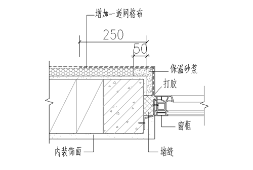 1.4外門(mén)窗洞口側(cè)面外保溫材料應(yīng)采用保溫砂漿,厚度為20mm。當(dāng)外保溫層厚度不超過(guò)30 mm,洞口保溫砂漿應(yīng)該轉(zhuǎn)入立面50 mm(厚度同外保溫層厚度)。