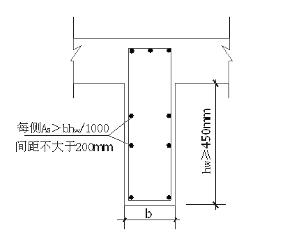 1.7 梁腹板高度hw≥450mm時(shí),應(yīng)在梁兩側(cè)面設(shè)置腰筋,鋼筋直徑不應(yīng)小于12mm,每側(cè)腰筋配筋率As>bhw/1000,間距不大于200mm如圖7.1.1-2所示。