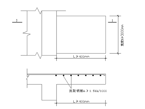 1.6 室外懸臂板挑出長度L≥400mm、寬度B≥3000mm時(shí),應(yīng)配抗裂分布鋼筋,直徑不應(yīng)小于6mm,間距不應(yīng)大于200mm,抗裂分布筋如圖7.1.1-1所示。